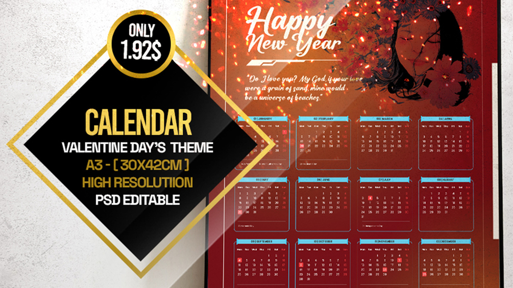 Calendar 2023 - Valentine Day's Theme - PSD Editable also JPG & PDF ready for print